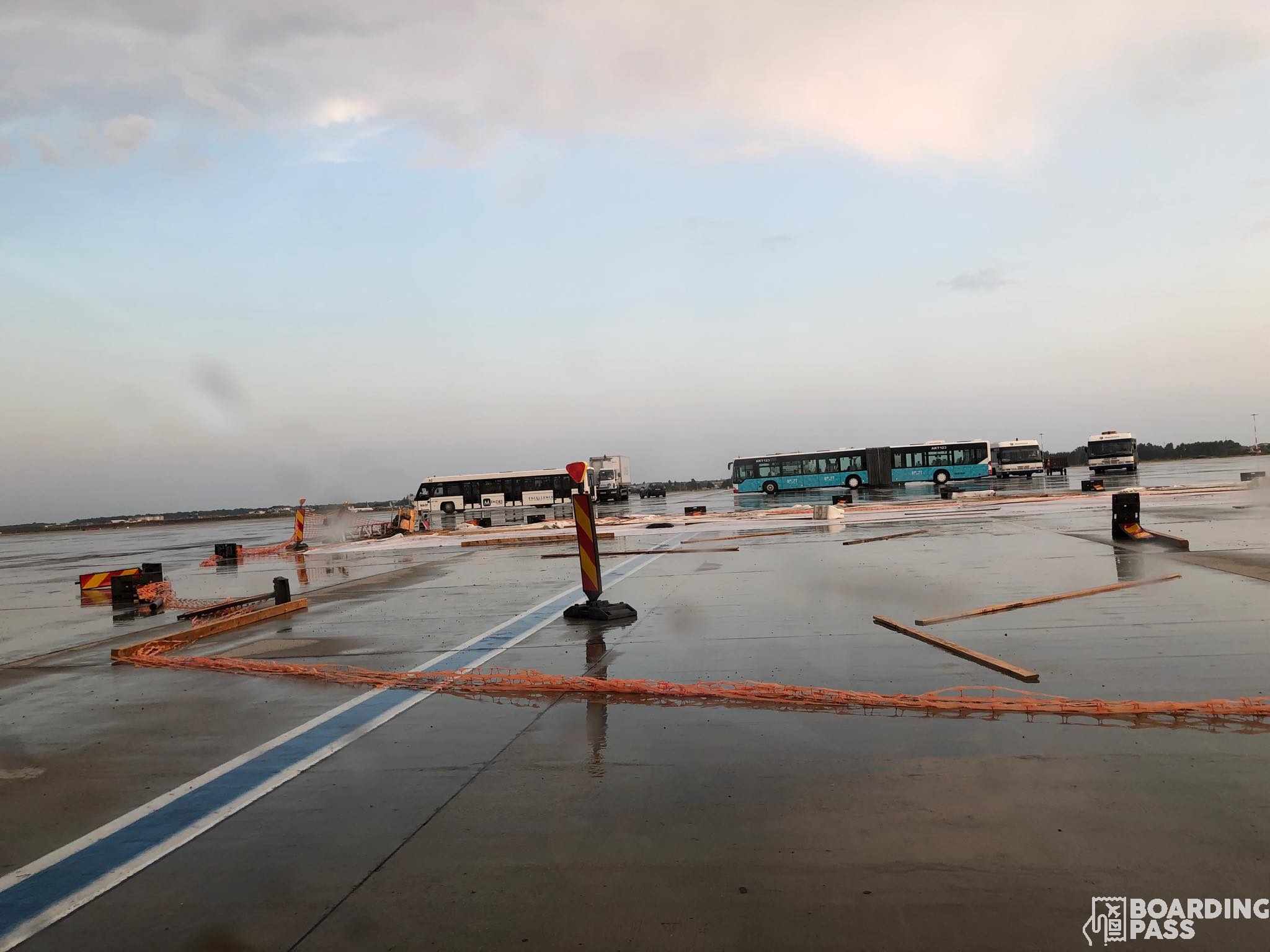 În plus, o parte din tavanul fals al unui pasaj exterior a căzut blocând astfel accesul vehiculelor prin acesta iar protecțiile folosite de compania care efectuează lucrări pe platforma aeroportului au fost aruncate de vânt pe sub avioanele din preajmă.