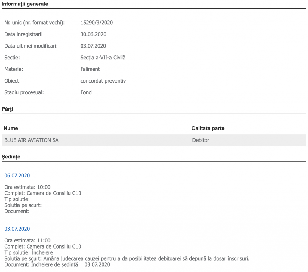 Judecarea solicitării companiei, înaintată cu dosarul numărul 15290/3/2020 din 30 iunie 2020, a fost amânată de judecători în 3 iulie „pentru a da posibilitatea debitoarei să depună la dosar înscrisuri”.