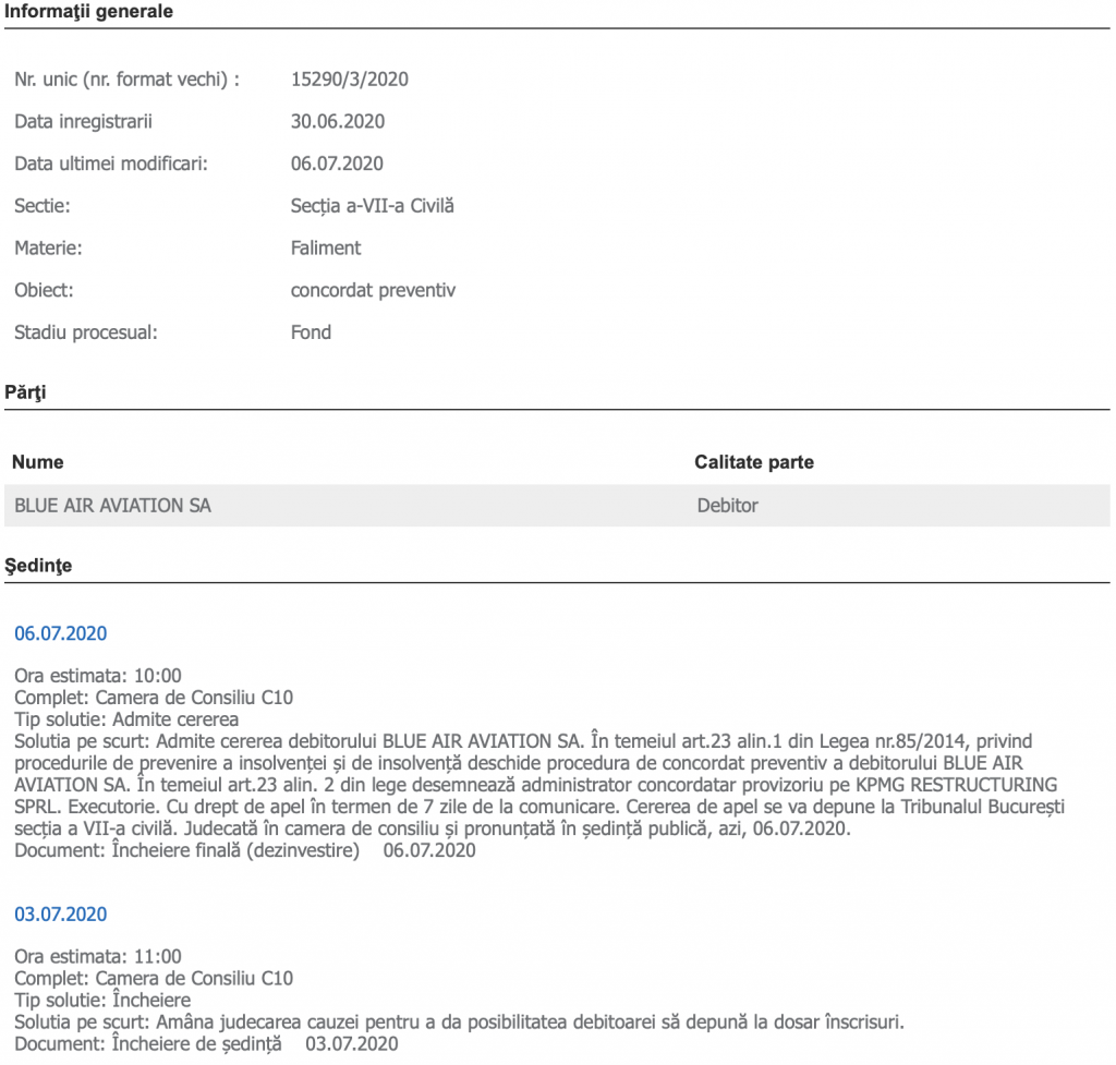 Admite cererea debitorului BLUE AIR AVIATION SA. În temeiul art.23 alin.1 din Legea nr.85/2014, privind procedurile de prevenire a insolvenţei şi de insolvenţă deschide procedura de concordat preventiv a debitorului BLUE AIR AVIATION SA. În temeiul art.23 alin. 2 din lege desemnează administrator concordatar provizoriu pe KPMG RESTRUCTURING SPRL. Executorie. Cu drept de apel în termen de 7 zile de la comunicare. Cererea de apel se va depune la Tribunalul Bucureşti secţia a VII-a civilă. Judecată în camera de consiliu şi pronunţată în şedinţă publică, azi, 06.07.2020.