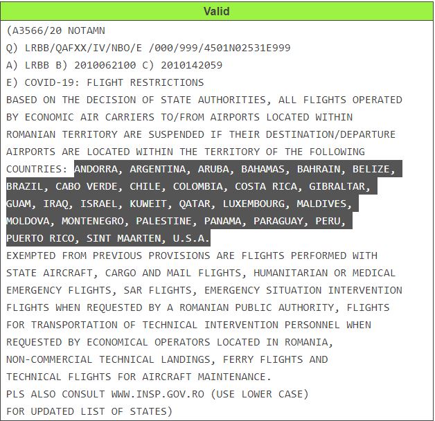Potrivit NOTAM-ului publicat de Romatsa, zborurile comerciale regulate dintre România și țările și teritoriile din lista de mai jos rămân suspendate în perioada 7 octombrie – 15 octombrie.