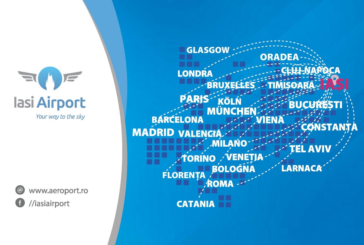 Cu BLUE AIR: Paris (Beauvais), Londra (Luton), Roma (Fiumicino), Barcelona, Bruxelles, Koln (Bonn), Torino (din 3 iunie 2017), Valencia (din 4 iunie 2017), Glasgow, Munchen, Florenta, Milano-Bergamo (toate patru, din 15 iunie 2017), Bucuresti, Cluj-Napoca, Timisoara, Oradea (via Bucuresti) si Constanta (din 15 iunie 2017);