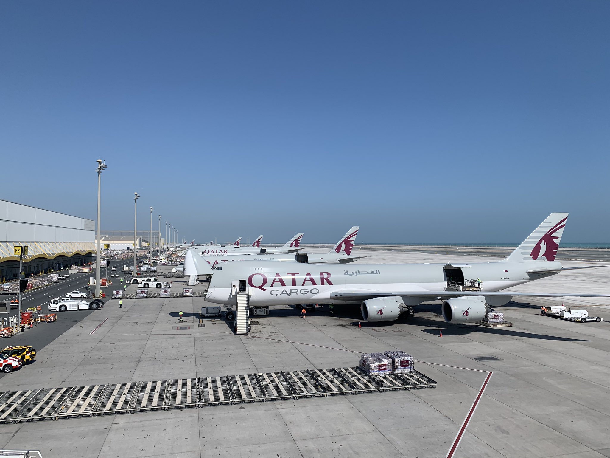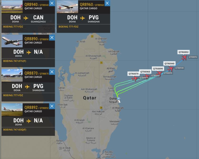 Cinci avioane din flota companiei aeriene Qatar Airways Cargo au decolat vineri la orele prânzului la interval de cinci minute de la Doha spre Beijing, Guangzhou și Shanghai, China.