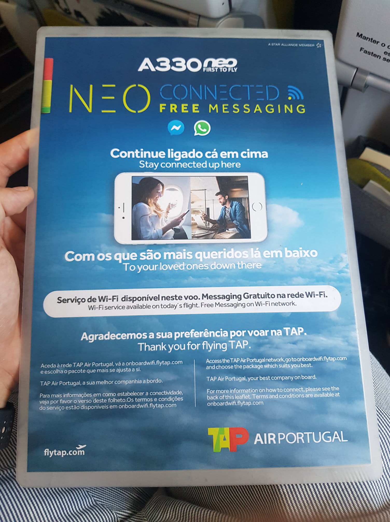 Avioanele A330neo ale TAP Air Portugal sunt echipate pentru a oferi internet Wi-fi. Tarifele pentru navigare sunt destul de mari, însă utilizarea unor servicii de mesagerie (WhatsApp şi Facebook Messenger) este gratuită.