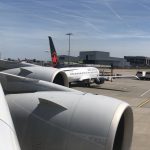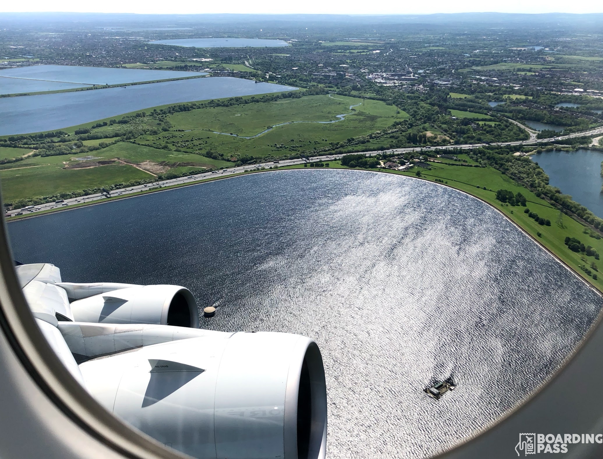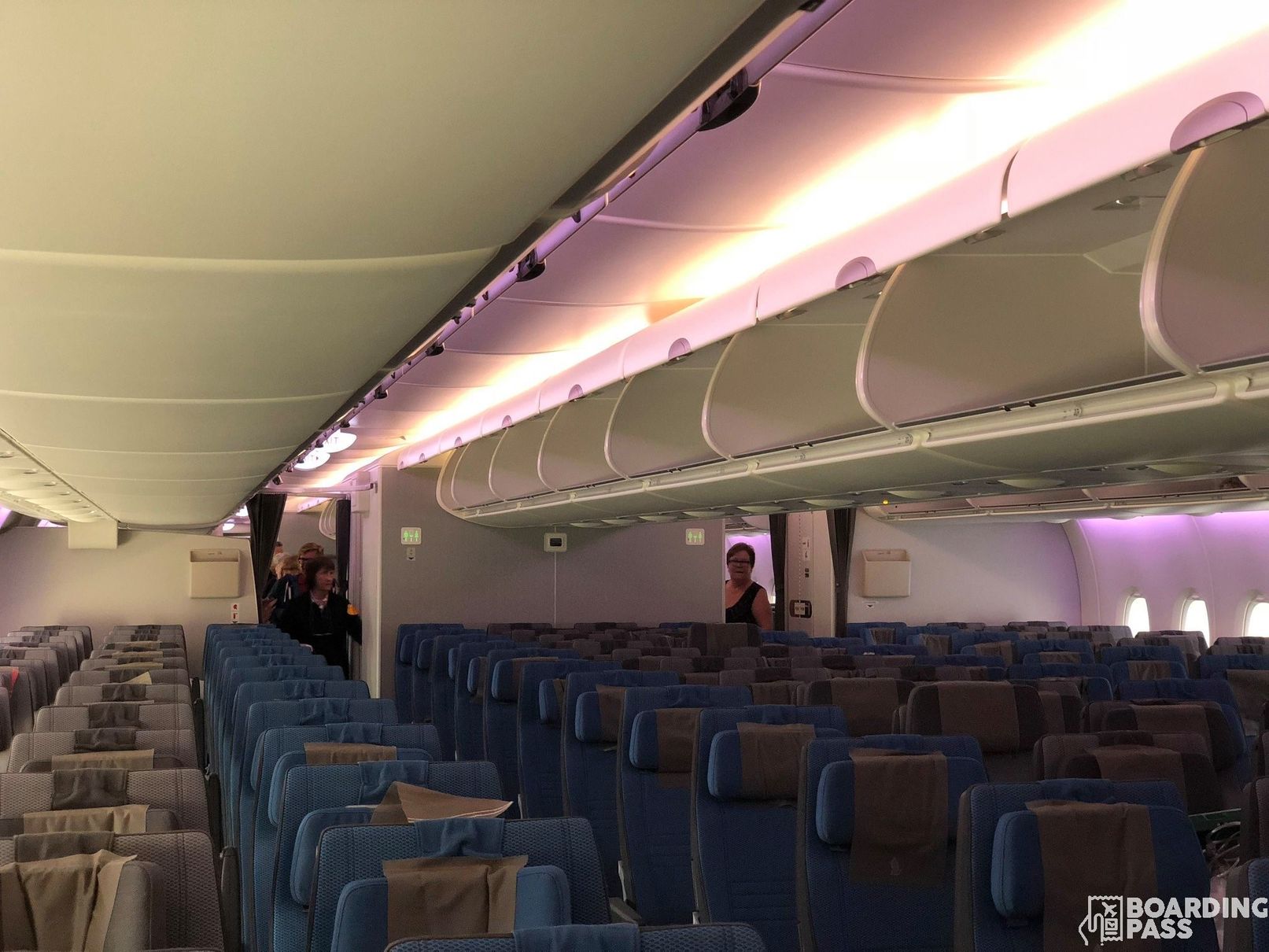 La îmbarcare s-au folosit două tuneluri de îmbarcare, unul pentru pasagerii care călătoresc pe puntea superioară a avionului unde se află clasele business și first iar celălalt a fost folosit pentru pasagerii din clasele premium economy și economy.