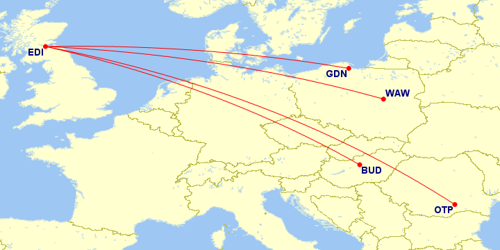 Tot din decembrie Wizz Air va mai lega Edinburgh și de Budapesta (din 21 decembrie, trei zboruri/săptămână), Varșovia (din 18 decembrie, patru zboruri/săptămână) și Gdansk (din 19 decembrie, trei zboruri pe săptămână).