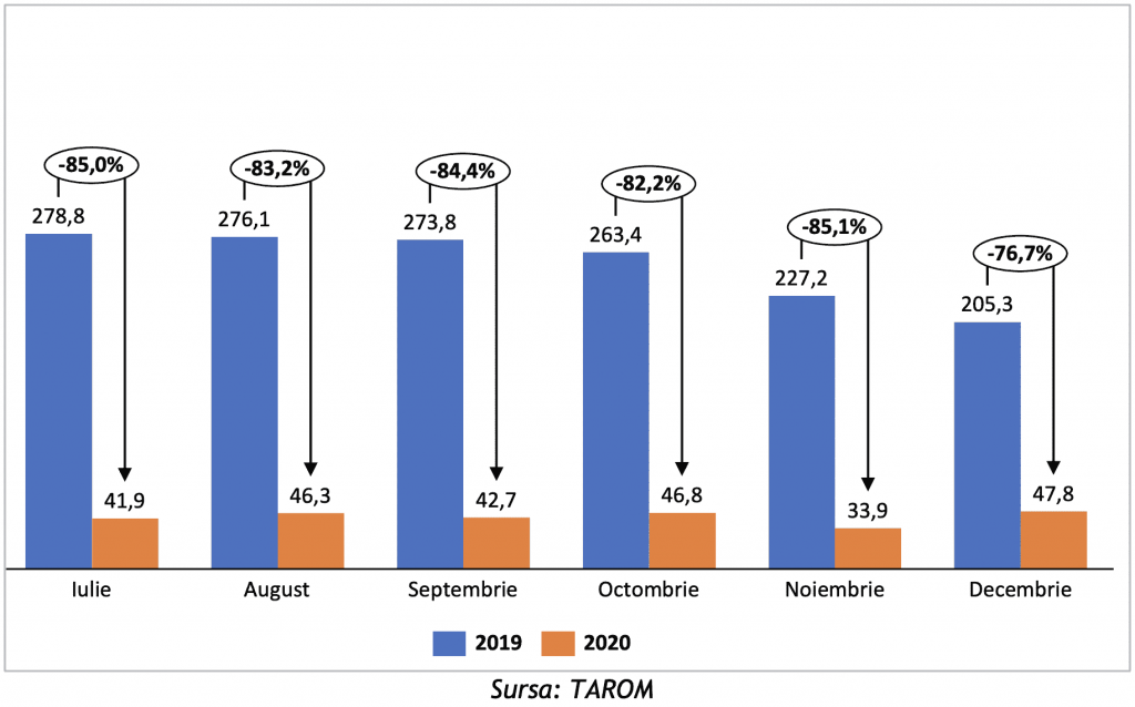 „În perioada 1 iulie 2020 – 31 decembrie 2020 veniturile TAROM din curse regulate au reprezentat aproximativ 15% din veniturile obținute în aceeași perioadă a anului 2019, în timp ce costurile directe nu au putut fi scăzute sub 30% din valoarea costurilor din aceeași perioadă a anului 2019,” se menționează în memorandumul aprobat de Guvern miercuri.