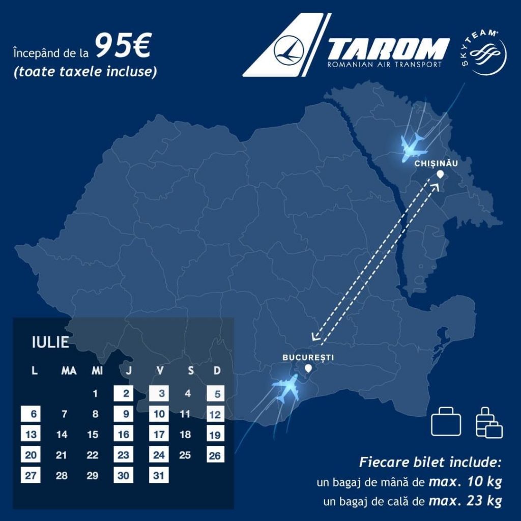 Ruta București – Chișinău va fi operată cu o frecvență de patru zboruri pe săptămână, în zilele de luni, joi, vineri și duminică.