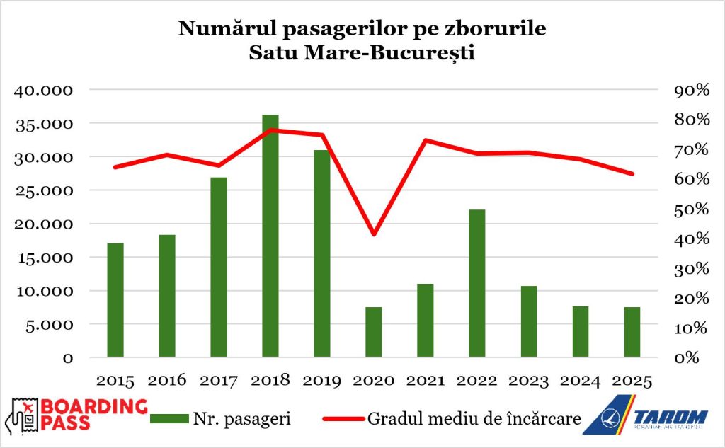 Aproape 200.000 de pasageri au zburat pe ruta București – Satu Mare în perioada 2015 – 2025, însă scăderea frecvenței zborurilor a dus la operarea ultimului zbor pe această rută în martie 2026.