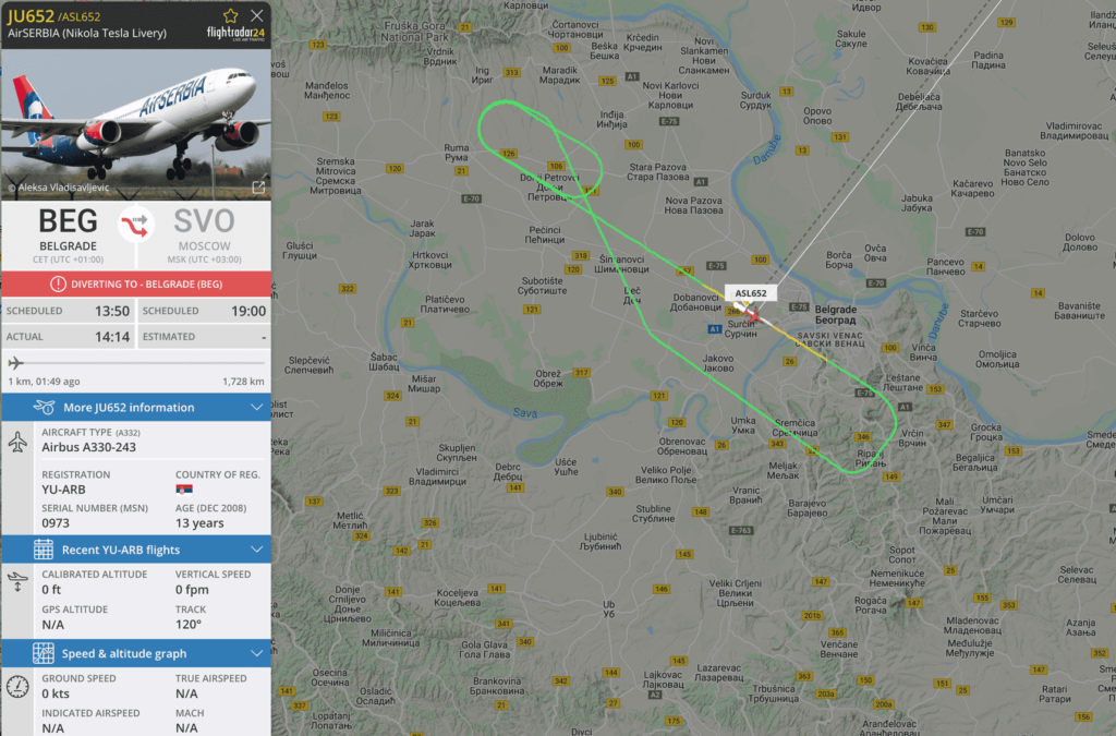 Airbusul A330 Air Serbia care a decolat vineri la ora 15:15 (ora României) din Belgrad spre capitala Rusiei a revenit pe aeroportul de origine din cauza unei alerte cu bombă.